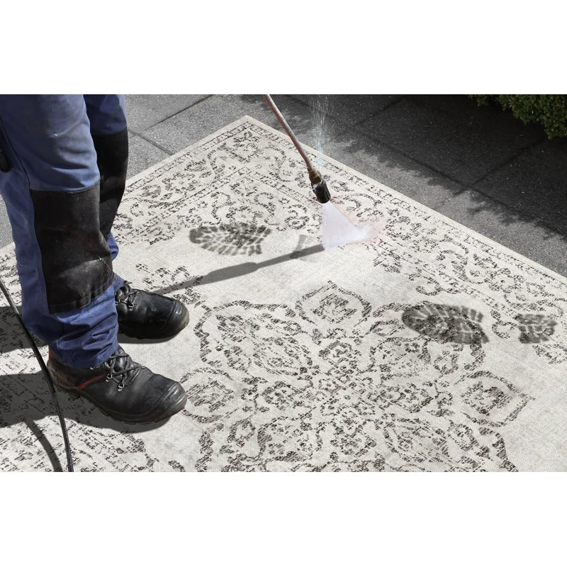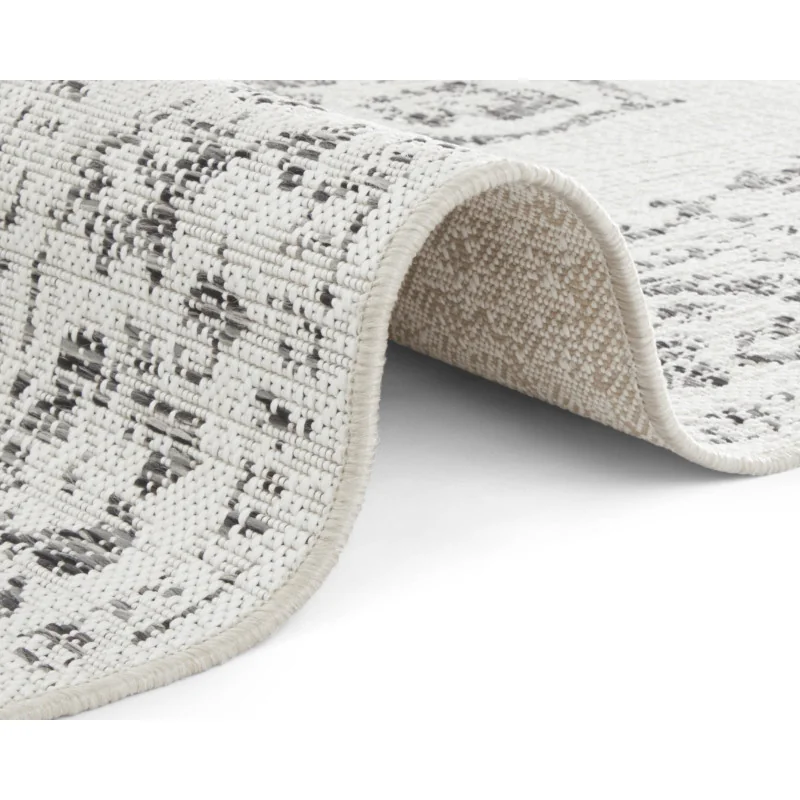 Wyjątkowe połączenie kremowego, szarego i antracytowego nadaje temu dywanowi niepowtarzalnego charakteru, który będzie pasował do różnych stylów aranżacyjnych. Dzięki temu dodatkowi stworzysz elegancką i przytulną przestrzeń na zewnątrz.