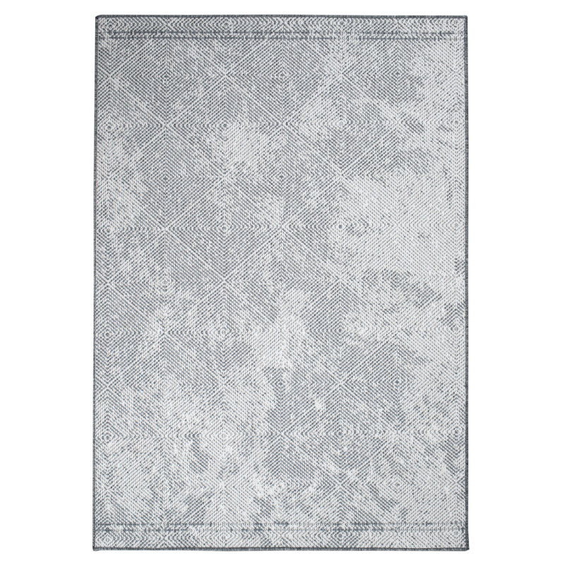 Funkcjonalny, dwustronny dywan DUO 58450 w eleganckim połączeniu szarości i kremu z geometrycznym vintage wzorem rombów. Doskonały do wnętrz i na zewnątrz — odporny na warunki atmosferyczne i łatwy w pielęgnacji.