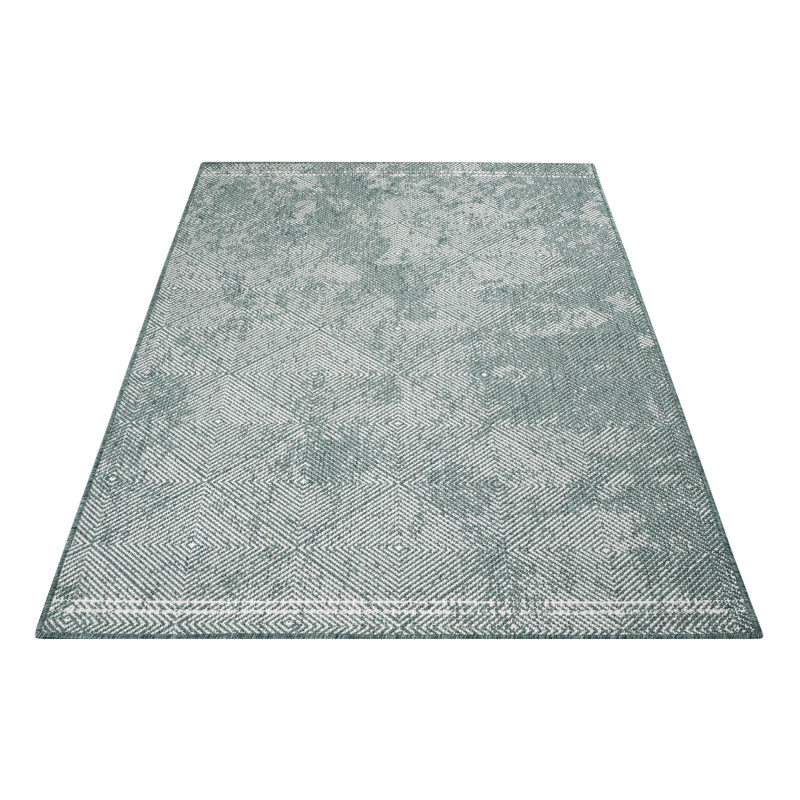 Funkcjonalny, dwustronny dywan DUO 58450 w modnym zielono-kremowym połączeniu kolorów z geometrycznym vintage wzorem rombów. Idealny do wnętrz i na zewnątrz, odporny na warunki atmosferyczne i łatwy w pielęgnacji.