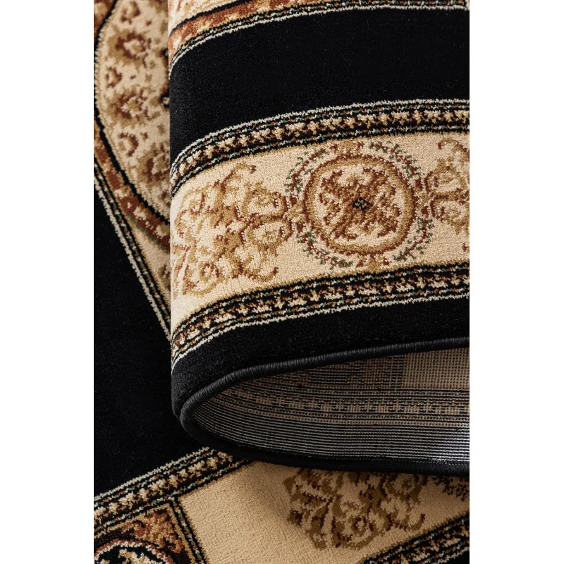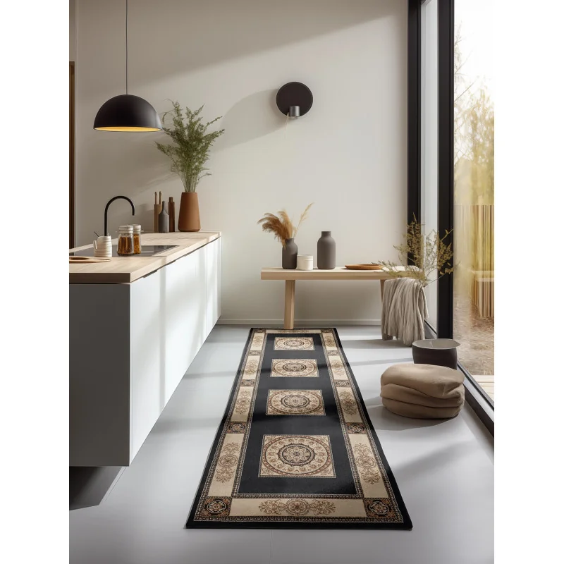 Podkreśl wyjątkowy charakter swojego wnętrza dzięki chodnikowi Herat 105998 Czarny o wymiarach 80x240 cm. Jego klasyczny wzór w eleganckiej, głębokiej czerni z kontrastującymi kremowymi i beżowymi akcentami doskonale komponuje się zarówno z tradycyjnymi, jak i nowoczesnymi aranżacjami. Bogato zdobione ornamenty inspirowane orientalnym wzornictwem nadają wnętrzu luksusowy wygląd, jednocześnie zapewniając ciepło i przytulność.