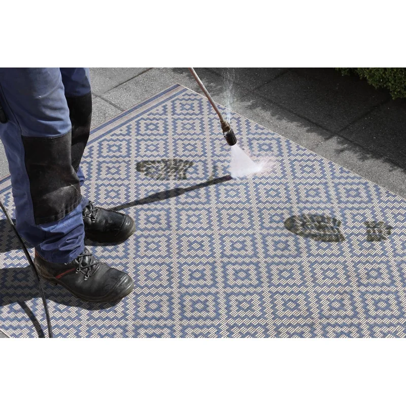 Dzięki swojej płaskiej strukturze, dywan Meadow 102464 Blue Cream jest łatwy w czyszczeniu. Może być również prany, co ułatwia utrzymanie go w czystości. Dodatkowo, jest odporny na warunki atmosferyczne, dzięki czemu doskonale sprawdza się na zewnątrz.