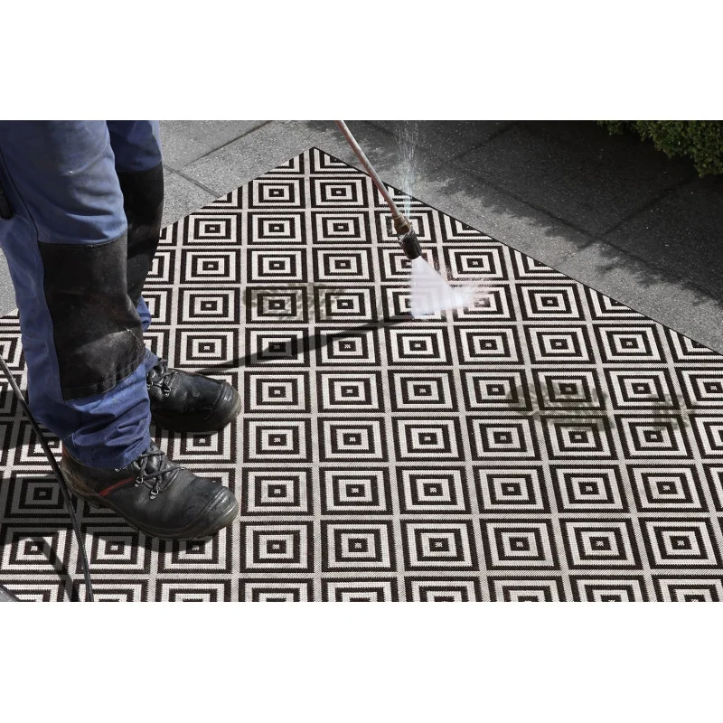 Dzięki swojej płaskiej strukturze, dywan Meadow 102470 Black jest łatwy w czyszczeniu. Może być również prany, co ułatwia utrzymanie go w czystości. Dodatkowo, jest odporny na warunki atmosferyczne, dzięki czemu doskonale sprawdza się na zewnątrz.