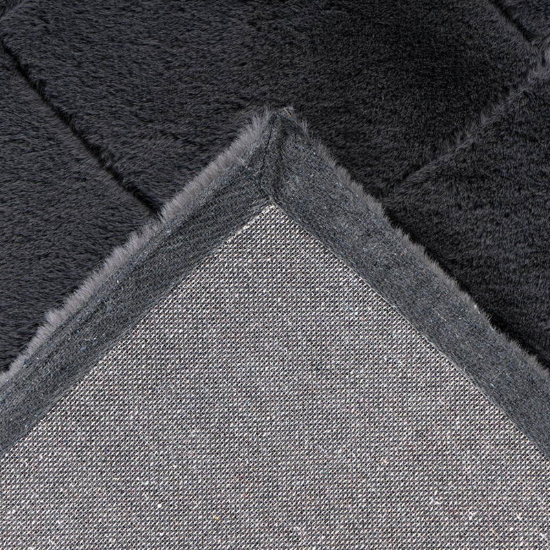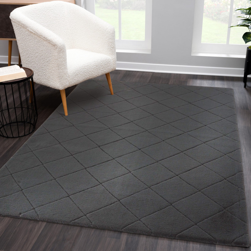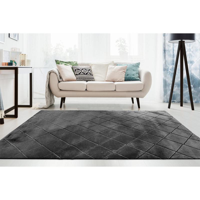 Stylowy dywan z kolekcji Momenta w modnym grafitowym kolorze, wykonany z miękkiego, wysokiego runa o pikowanym wzorze rombów 3D. Idealny do wnętrz ceniących komfort i nowoczesny design.