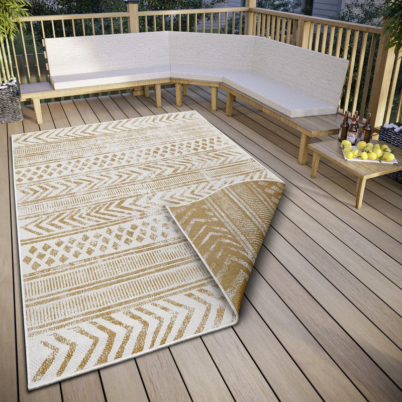 Wzbogać swoją przestrzeń o wyjątkowy dywan Twinsupreme 105787 w ciepłych odcieniach ochry i kremu. Jego dwustronny design oraz odporność na warunki atmosferyczne sprawiają, że jest to idealne rozwiązanie do zarówno wnętrz, jak i na zewnątrz. Doskonale pasuje na tarasy, balkony, ale również do salonów, jadalni czy sypialni, wprowadzając do każdego pomieszczenia nowoczesny, a zarazem przytulny klimat.