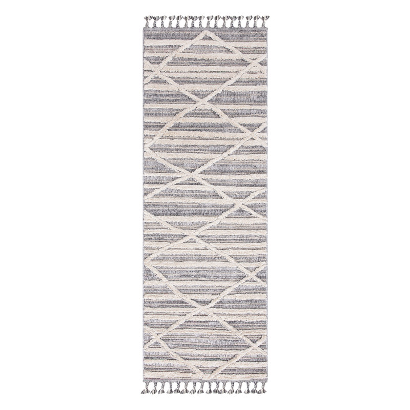Dywan Valora 8100 w stylu boho-chic to połączenie elegancji i komfortu. Reliefowa struktura, frędzle i subtelna paleta szarości i kremu tworzą modny i przytulny akcent do każdego wnętrza.