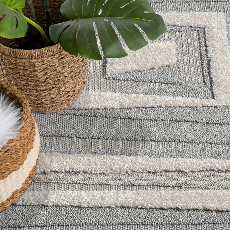 Dywan Valora 9400 to połączenie nowoczesnej abstrakcji z geometryczną precyzją, utrzymane w stonowanej szaro-kremowej kolorystyce. Styl boho-chic podkreślają ozdobne frędzle oraz trójwymiarowa struktura uzyskana dzięki technice Cut&Loop.