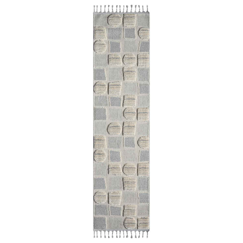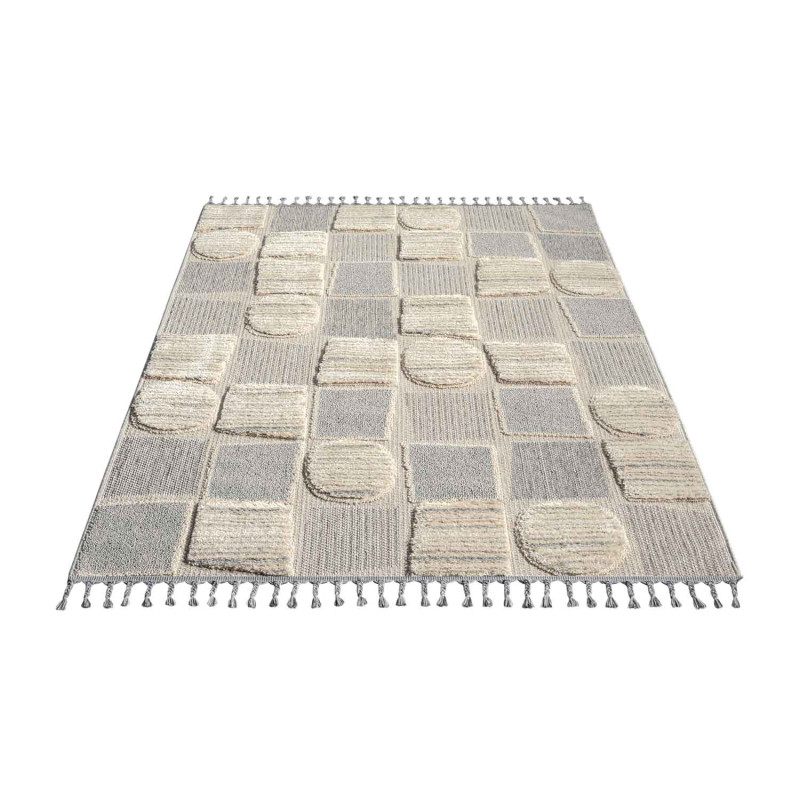Dywan Valora 9500 w eleganckim, szarym kolorze to klasyczny przykład boho-chic z techniką Cut&Loop i dekoracyjnymi frędzlami, które dodają wnętrzu przytulności i stylu.